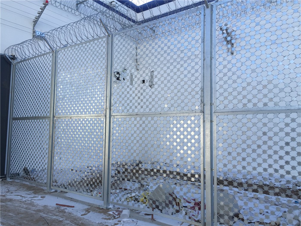 (4)監獄收押通道隔離網網片邊框: 矩形管50*505mm ;網絲與形管點焊,焊接質量符合孤焊焊接工藝規程的要求。焊接成型后做整體電解拋光處理,矩形管、網絲和鋼管材質標準:SUS304不銹鋼。監獄AB車行通道隔離網基礎及安裝。