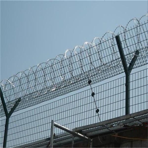 Y型架上邊架蛇腹型刀刺:由熱鍍鋅鋼板或不銹鋼薄板沖壓出尖利的刀片狀,高張力鍍鋅鋼絲或者不銹鋼絲做芯線組合而成的阻盡器材。刀
