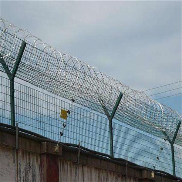 2500mm -3000毫米,頂部安裝V型刀片刺網的高度,用50厘米直徑60厘米,主要由熱浸鍍鋅鋼板或不銹鋼薄板金屬形成的剃刀線,它有鋒利的刀片,高強度鍍鋅鋼絲或不銹鋼絲相結合的產物。由于刺網的形狀很特別,每個點都有一個刀片狀的提示,從而可以實現出色的防守保護作用 監獄隔離網墻的優點 1.產品美觀,實用,方便運輸和安裝的特點