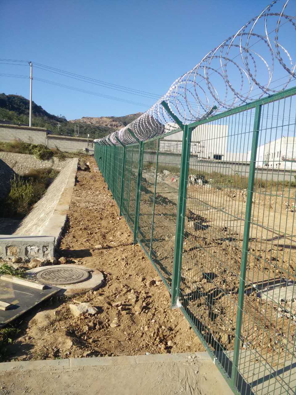 5、立柱規(guī)格: 60mmx80mm*3mm、80mmx80mm*3mm、 φ48、 φ60等方管、 圓管;上方為蛇腹型刀刺網(wǎng)500mm、600mm。