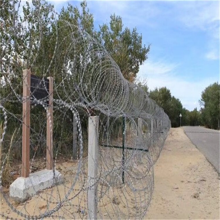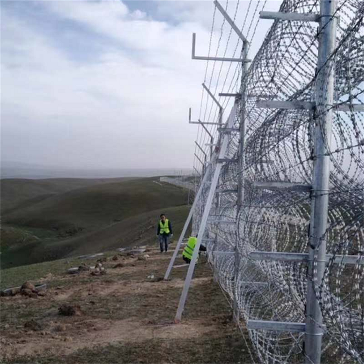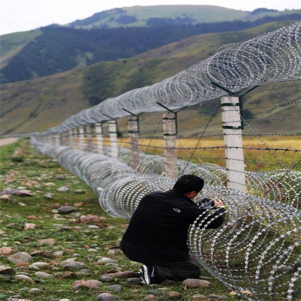 邊防是國家行為,國家對邊防實施高度集中統一領導,對處理邊防涉外事務的權限作出嚴格規定,中國的許多邊境地區都安裝了護欄或者鐵絲網產品,中國的邊境線蜿蜒漫長,安裝邊境線鐵絲網和邊境護欄是為了保護國土的完整性,這樣的鐵絲網產品可以有效防止外來人員隨隨便便的進入我國邊境,也為邊境地區的老百姓設立了一道安全鐵絲網圍墻。那么一般我們采用什么樣的方式來保護我們的呢?常用于刀刺網,刀刺網分為好幾種Φ500、Φ600、Φ800圈徑,可以跟立柱連接,拉上刺繩,在拉上刀刺網,根據高度上下幾圈都可以。