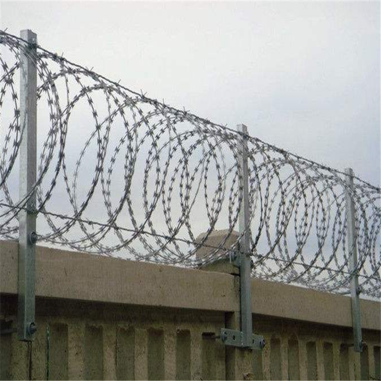 刺絲滾籠主要包括刀片剌網,刺繩,和支架等.安裝好后具有很好的阻嚇效果,與能起到相同作用的產品比起來性價比是高很多的.主要制作工藝就是由熱鍍鋅鋼板或者不銹鋼鋼板沖壓出尖銳的刀片,然后由高張力鍍鋅鋼絲或者不銹鋼絲來做芯線組合構成的防護產品。
