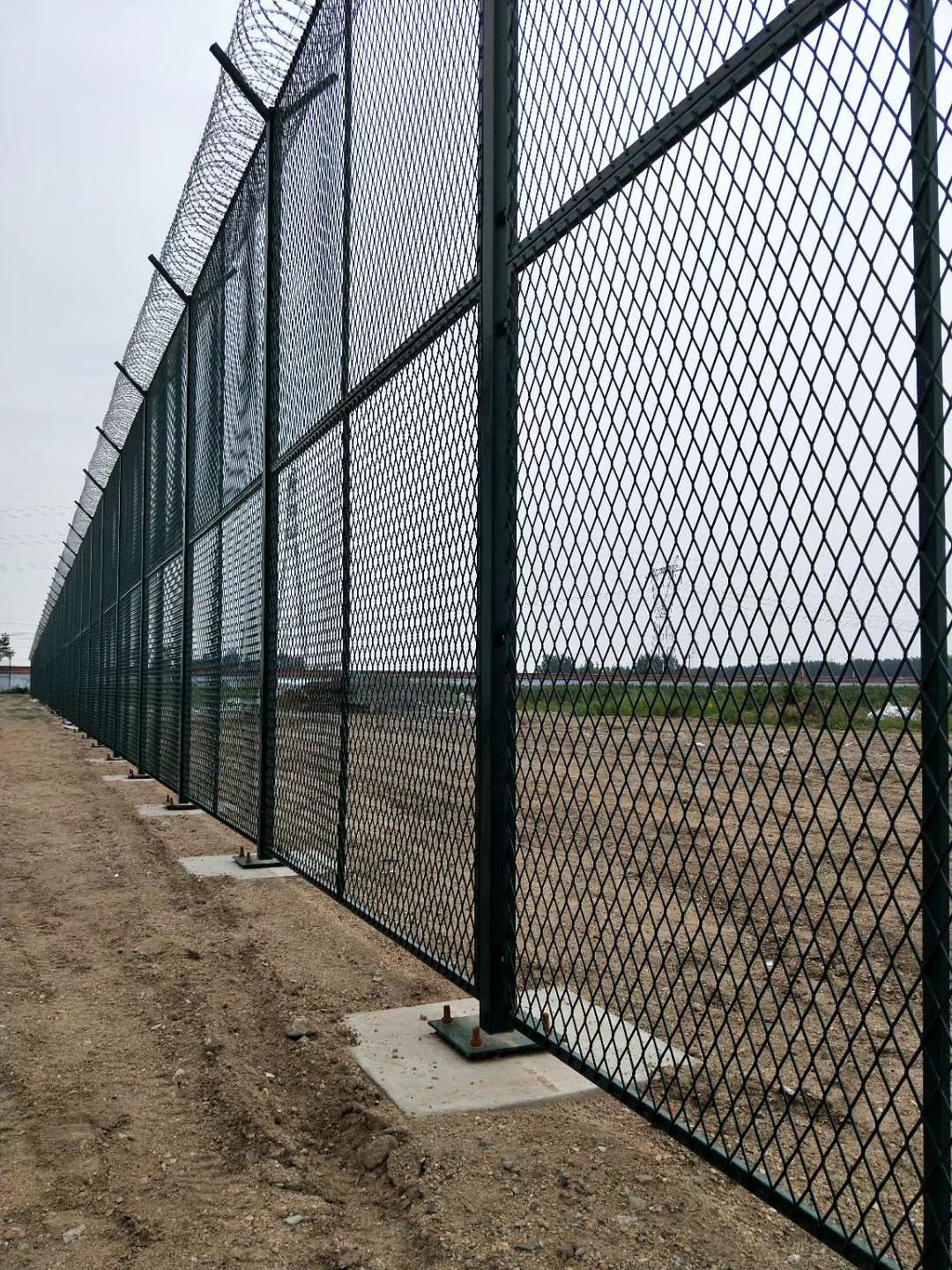 看守所、拘留所防攀爬隔離網立柱底座采用預埋方式安裝,預制預埋鐵件與立柱法蘭盤連接,立柱底座為200*200*10mm,預埋件四角預制四個直徑16mm熱鍍鋅螺栓(每個螺栓中心為距基礎兩邊150mm的交叉點),從頂端往下長度不小于150mm,螺栓高于底座平面50mm(底座平面應與所在位置最終地面高度在同一水平高度),螺栓間距200mm*200mm,與立柱法蘭盤螺孔相匹配。立柱保持豎直、不歪斜。也可預埋,底部提前焊好鋼板,在把底盤焊接在鋼板上,最后在進行水泥澆筑,然后抹平。